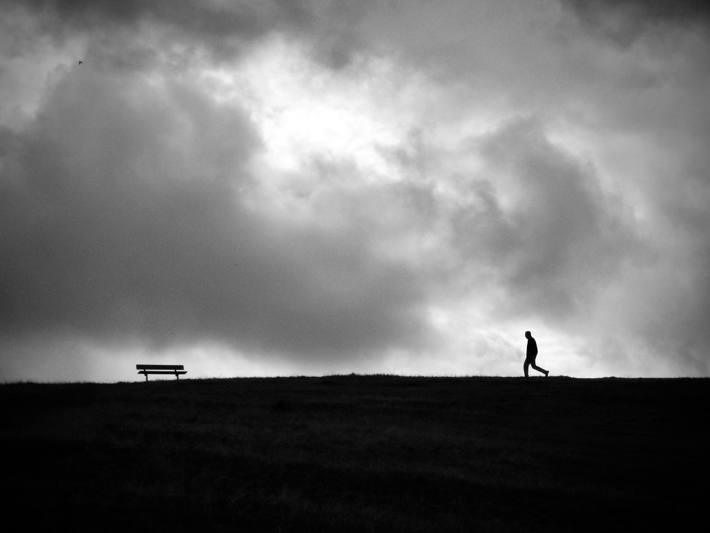 Windy cold day a few years back in the lee of Parliament hill, Hampstead Heath. I saw the walker crossing the skyline towards the bench. I shot a few frames at the point where he was best backlit against the sky and this is the one I liked the most. It was very cold, the one where your ears ache.