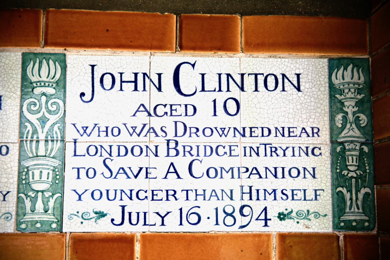Each tile conveys a poignant story of an individual who paid the ultimate price in their efforts to save others. They cover many acts of selfless bravery and extraordinary courage; the rescuing of people from burning buildings, from drowning in rivers and canals, from industrial accidents, even a shipwreck. The first recorded act of heroism dates back to 1863, and the most recent is from 2009 for a printmaker who jumped into the Thamesmead canal to save a boy from drowning. As you look through the individual stories, its impossible not to be deeply moved by them.